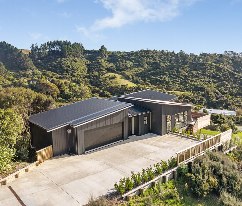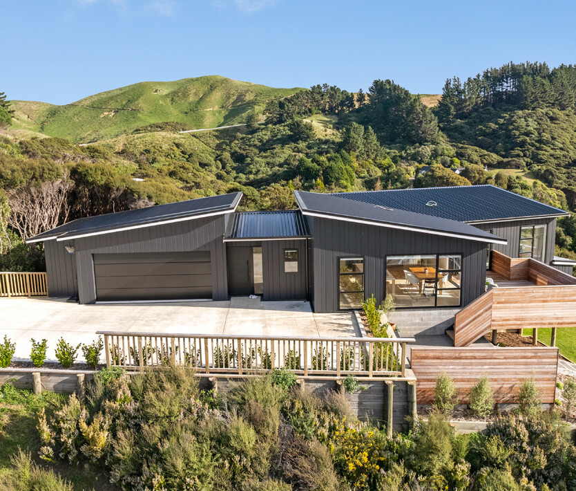 Cladding - vertical shiplapped paneling at random, mono pitch roof, incorporated into the large angled ceiling spaces to capture the surrounding view.
