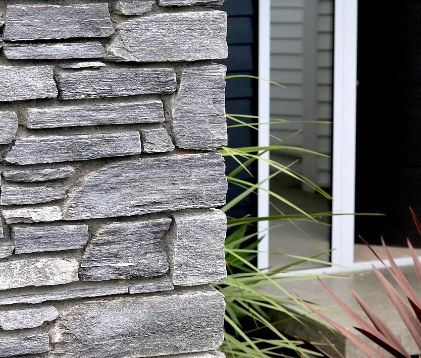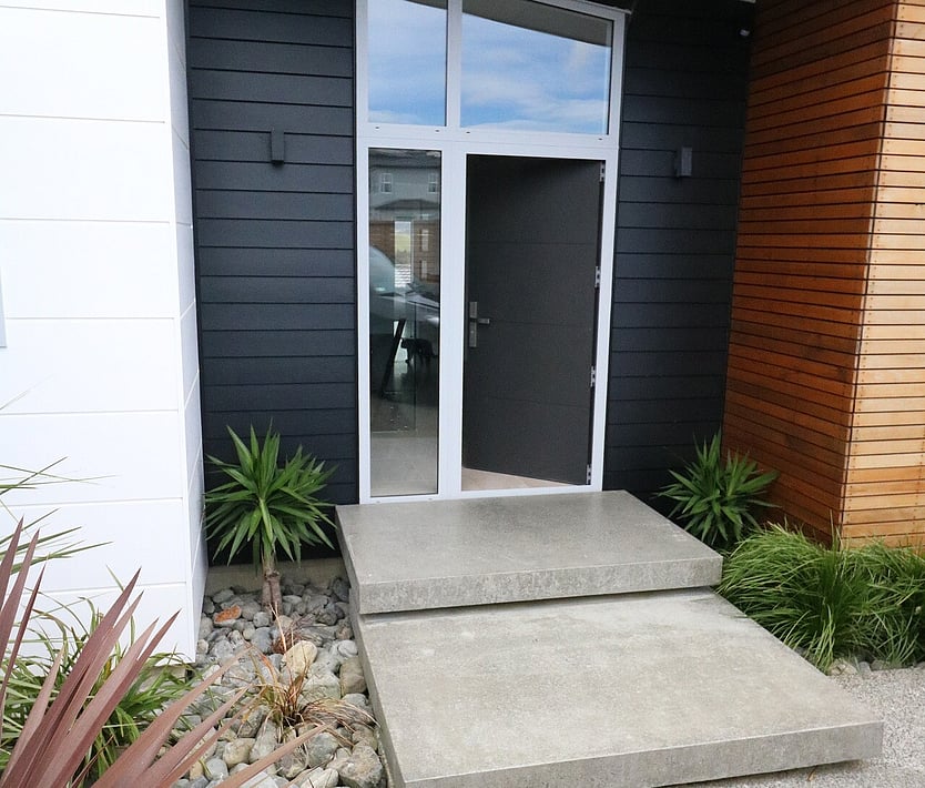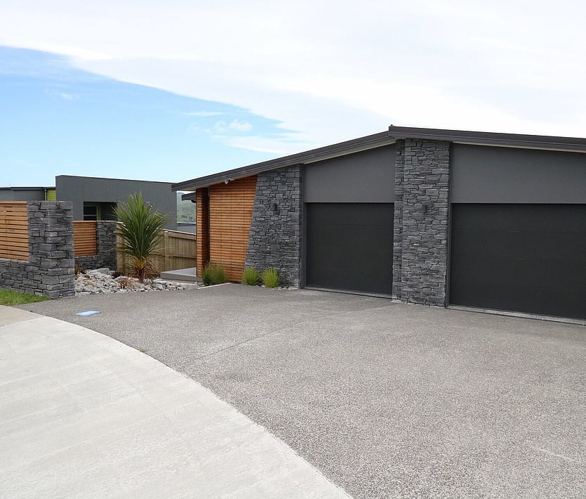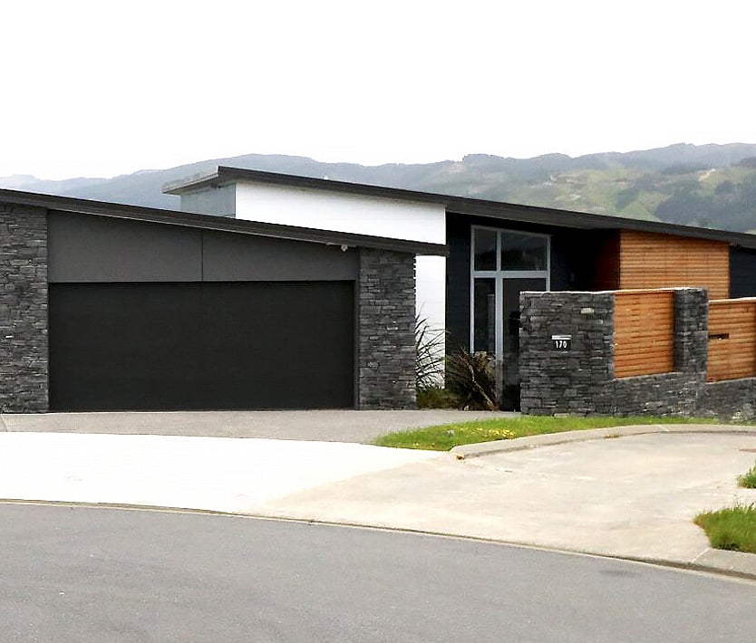 Cladding - schist, liner weatherboard (mixed colours), cedar with a mono pitch roof and floor to ceiling joinery to capture the surrounding view's.